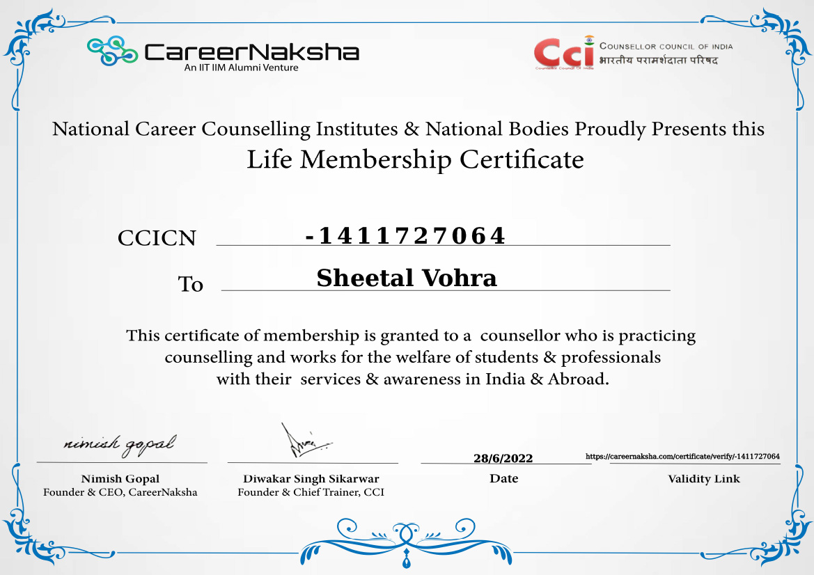 As a Certified Career Coach and Lead Partner of Career Naksha in Pune, I have guided hundreds of students from Grades 6 to 12 through psychometric testing, aptitude assessments, profile building, and university admissions. I collaborate with schools to deliver impactful sessions on career awareness, goal setting, and personality development.