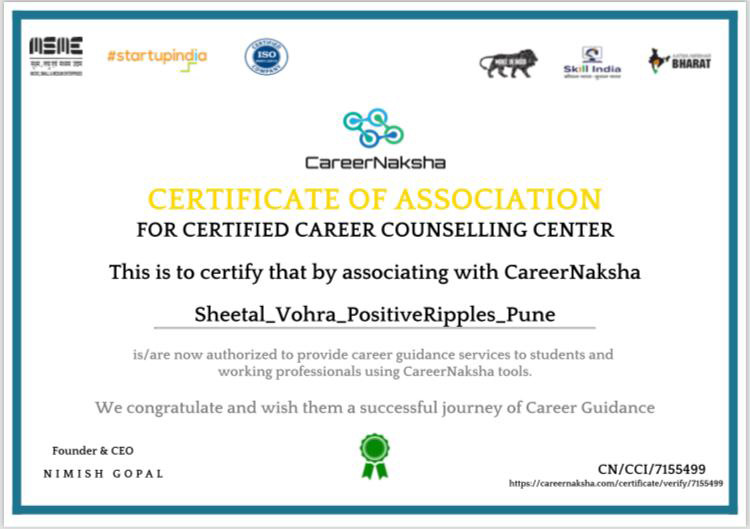 As a Certified Career Coach and Lead Partner of Career Naksha in Pune, I have guided hundreds of students from Grades 6 to 12 through psychometric testing, aptitude assessments, profile building, and university admissions. I collaborate with schools to deliver impactful sessions on career awareness, goal setting, and personality development.